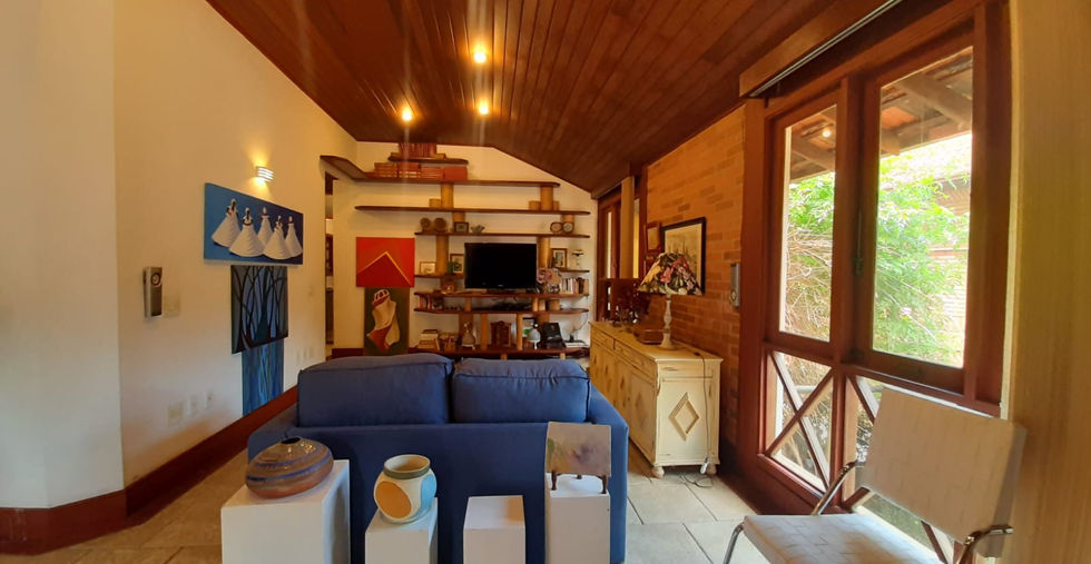 Subindo para o segundo piso, você encontrará a suíte master de 50 m², que conta com uma sala de TV exclusiva e uma sacada com vista para as montanhas. O banheiro é um verdadeiro destaque, com uma elegante pia em bancada de pinho de Riga e um closet. Este andar também abriga uma área de serviço com acesso à caixa d'água e ao pressurizador.